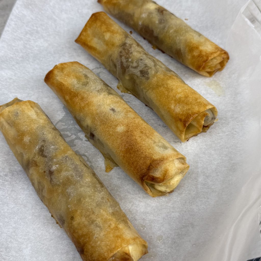 Étaler une feuille de brick, la replier légèrement sur un côté et rajouter la farce au milieu.