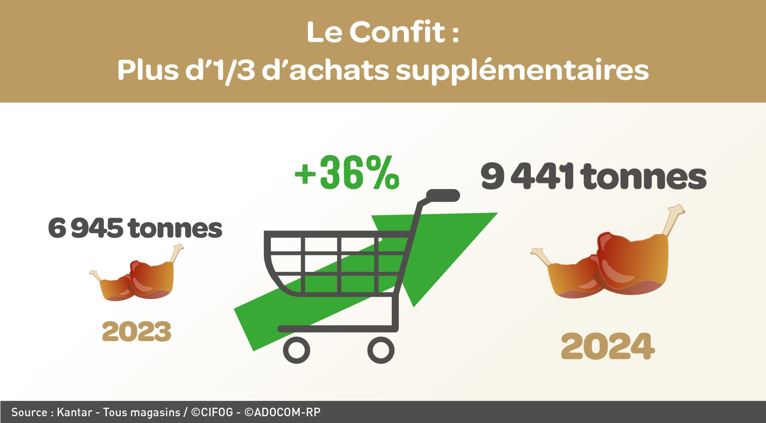 Le Confit de canard a pris le chemin de la croissance en 2024 dans les magasins, avec une hausse de +36 % en volume comparé à 2023. Le taux de ménages acheteurs s’élève à 22,1 % en 2024, soit + 7pts comparé à 2023. Les ménages ont acheté en moyenne 1,8 kg, quantité répartie en près de 2 fois sur l’année (1,9 fois en 2024). (Source : Kantar 2024)