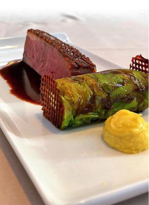 Magret de canard, nem de choux farci au canard, purée de maïs et jus de canard
